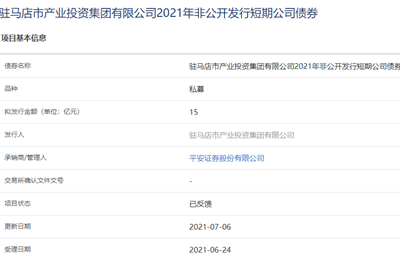 7月6日,據(jù)上交所公司債券項(xiàng)目信息平臺(tái)顯示,駐馬店市產(chǎn)業(yè)投資集團(tuán)有限公司2021年非公開發(fā)行短期公司債券獲上交所反饋。該債券擬發(fā)行金額為15億元,品種為私募債,承銷商及管理人為平安證券。